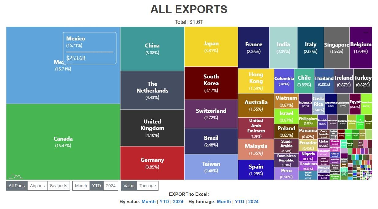On the import side, Mexico now accounts for 16.17% of all inbound shipments to the US, with Canada at 11.57% and China at 8.49%. Mexico has been the top importer for the past two years, overtaking China.