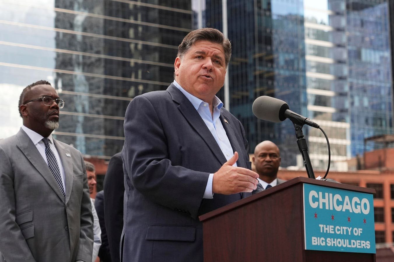 Illinois Gov. JB Pritzker speaks during a press conference at River Point Park, Monday, Aug. 25, 2025, in Chicago. (AP Photo/Nam Y. Huh)