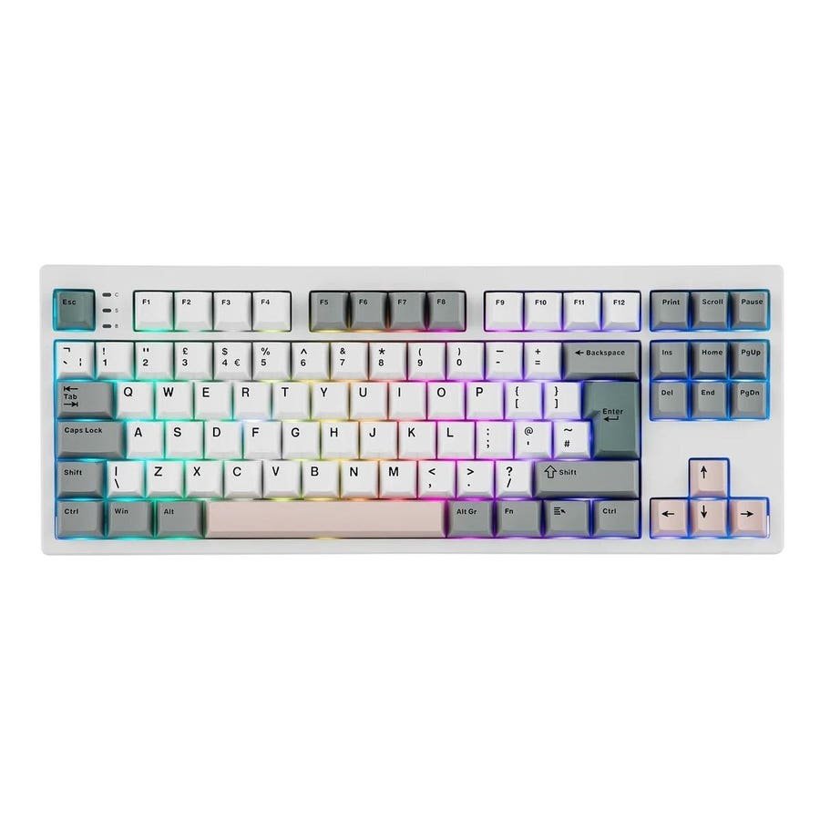 The TH87 87-key gaming keyboard has a clean and crisp design with keycaps finished in grey, soft teal and light blush. It is available in ANSI/ISO-DE/ISO-UK/JIS layouts.
