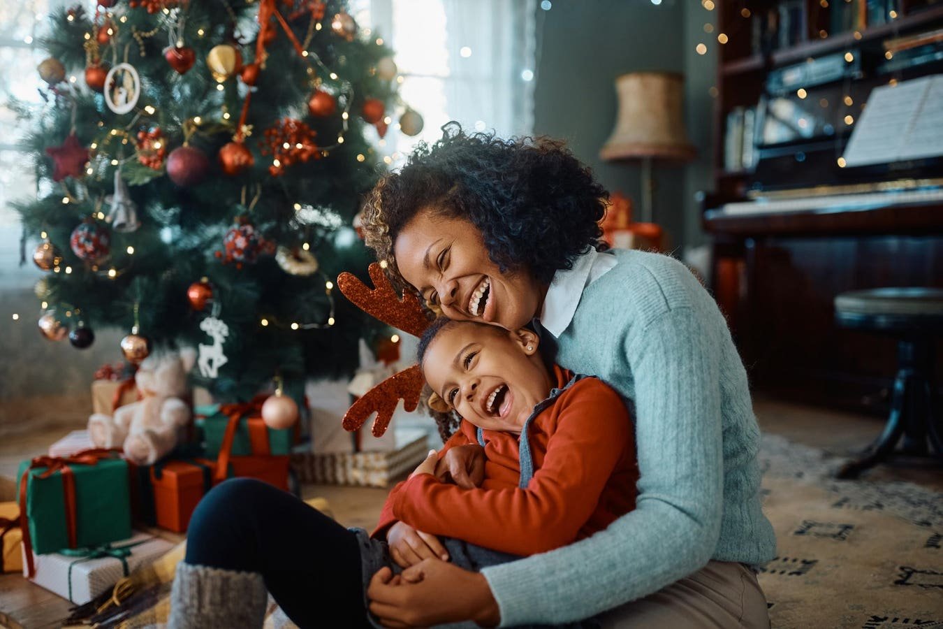 Happy African American mother and daughter laughing and having fun spending Christmas together at home.